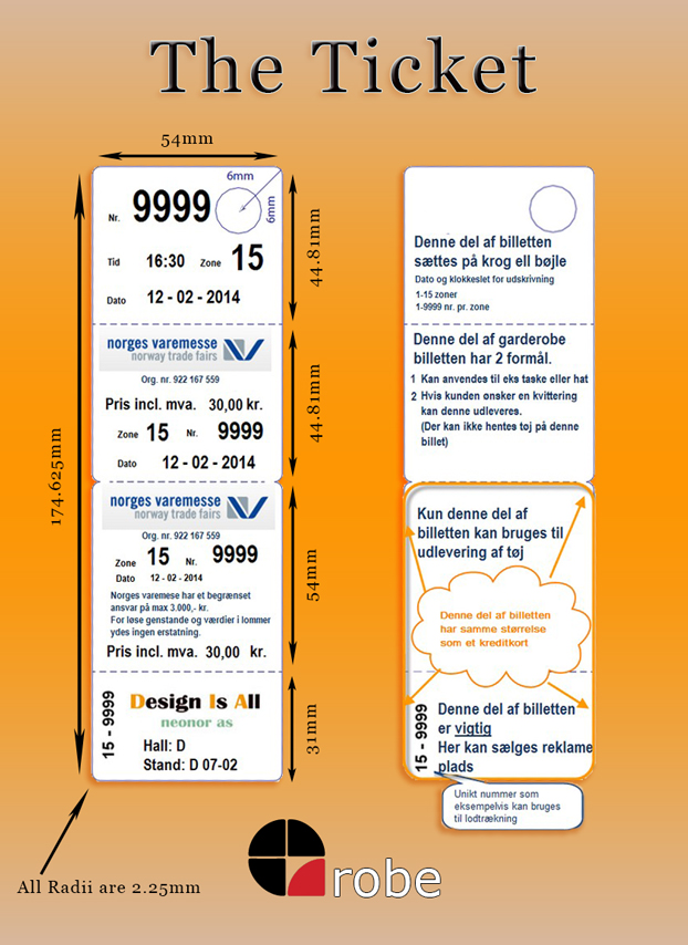 - Billetterne kan leveres i 4 farver til teatre, udstillingshaller hvor man typisk har flere garderober i samme lokale